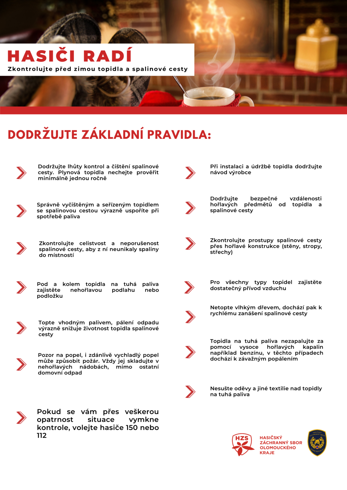 Brzy začne naplno topná sezóna. Jednou z nejčastějších příčin vzniku požárů, při kterých dochází k úmrtí, je špatný technický stav topidla nebo komínu. Pamatujte proto na bezpečnostní zásady a předejděte tak požáru ve vaší domácnosti.