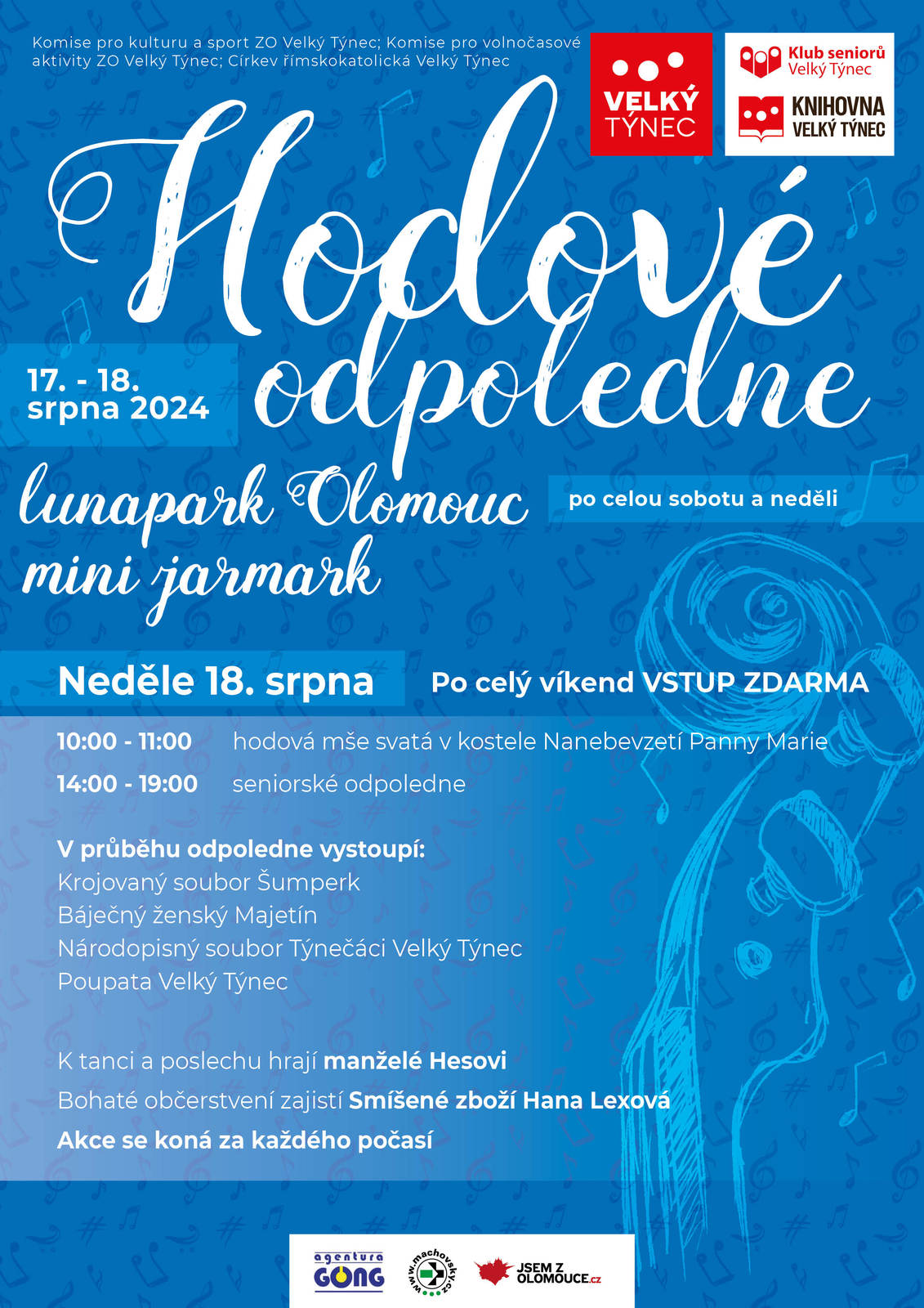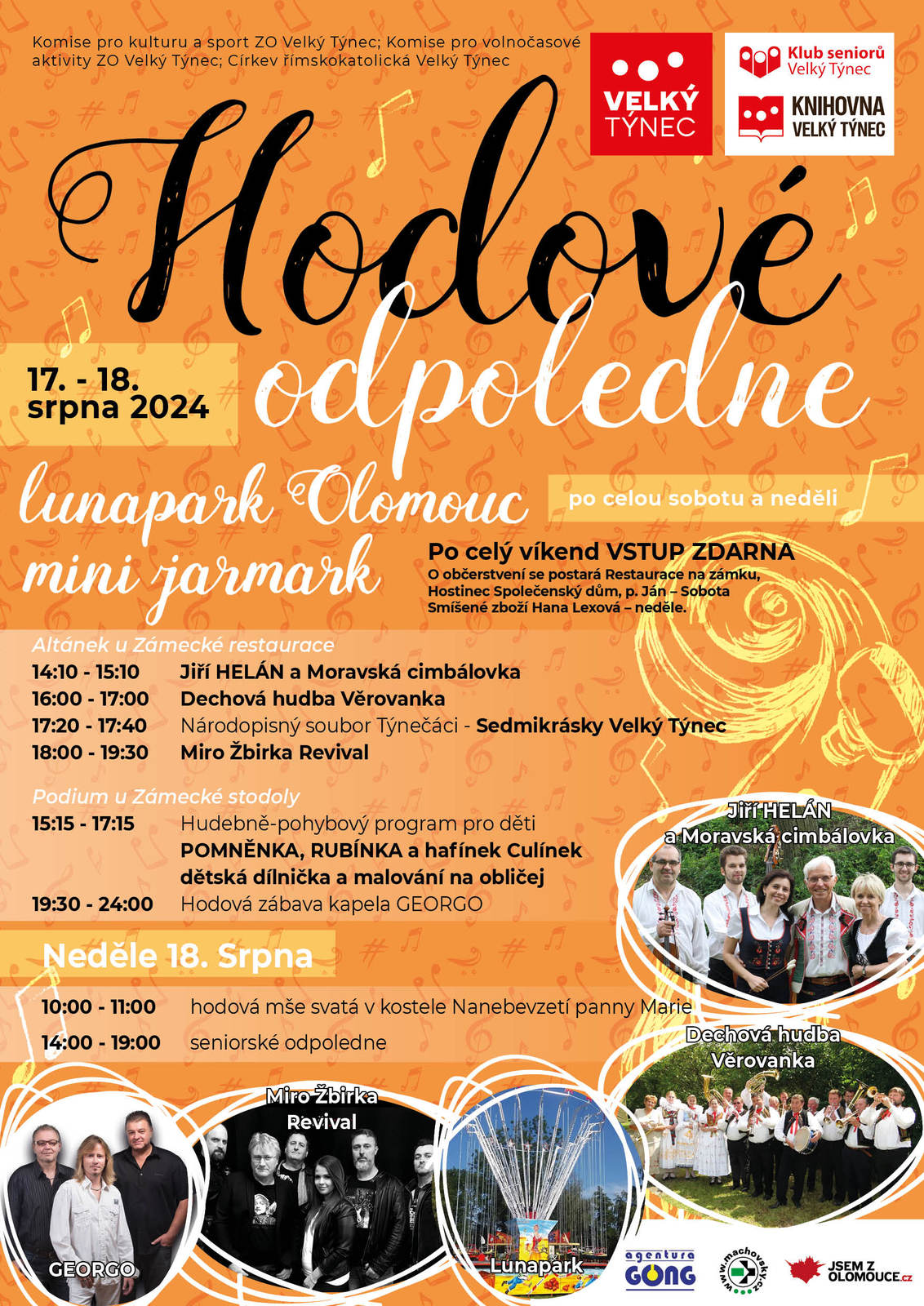 Komise pro kulturu a sport ZO Velký Týnec: Komise pro volnočasové aktivity ZO Velký Týnec: Církev římskokatolická Velký Týnec Vás srdečně zvou ve dnech 17. - 18.srpna 2024 na Hodové odpoledne v Zámecké zahradě.