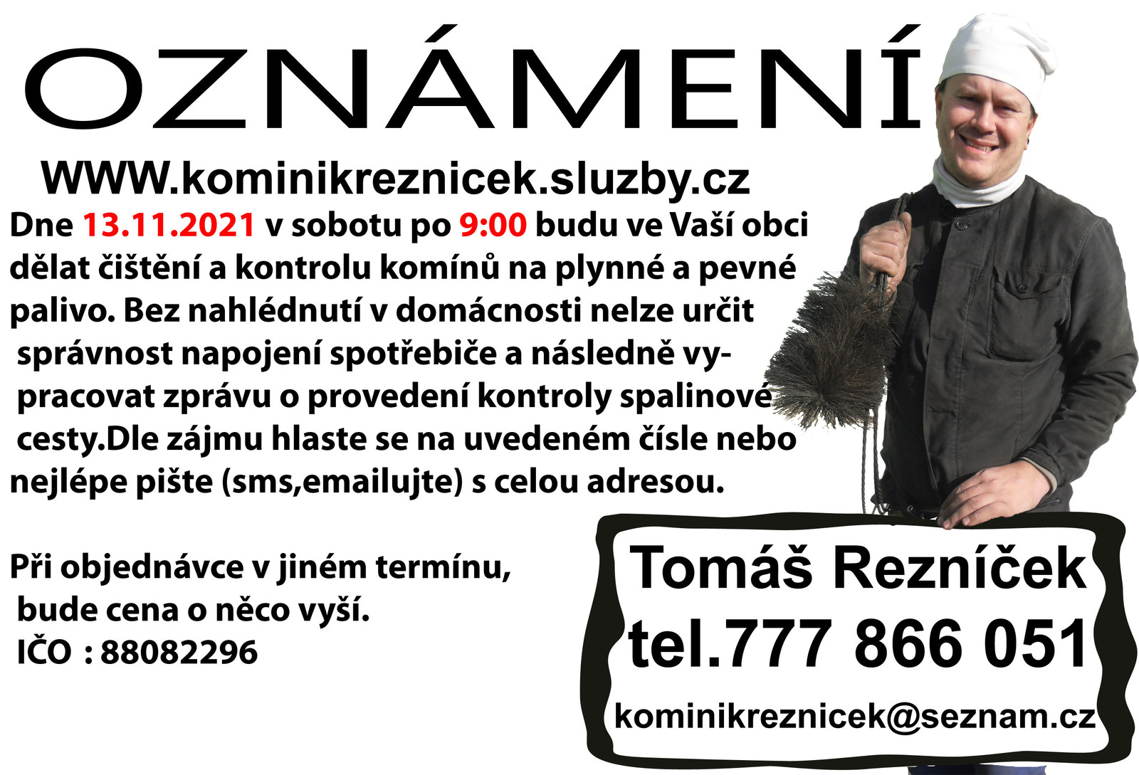 Úvod > Dění v obci > Aktuality > Oznámení - kominík T. Řezníček, 13.11.2021