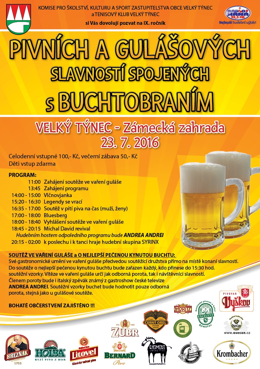 Úvod > Dění v obci > Aktuality > Pivní a gulášové slavnosti spojené s buchtobraním, Velký Týnec - Zámecká zahrada 23.7.2016
