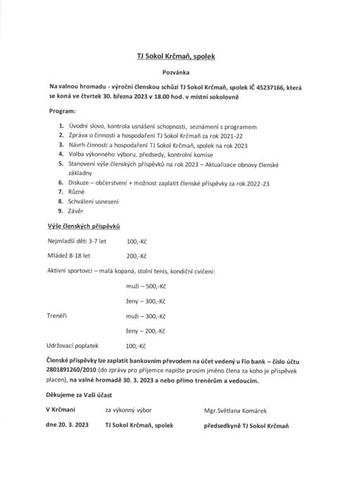Pozvánka na valnou hromadu TJ Sokol Krčmaň, spolek