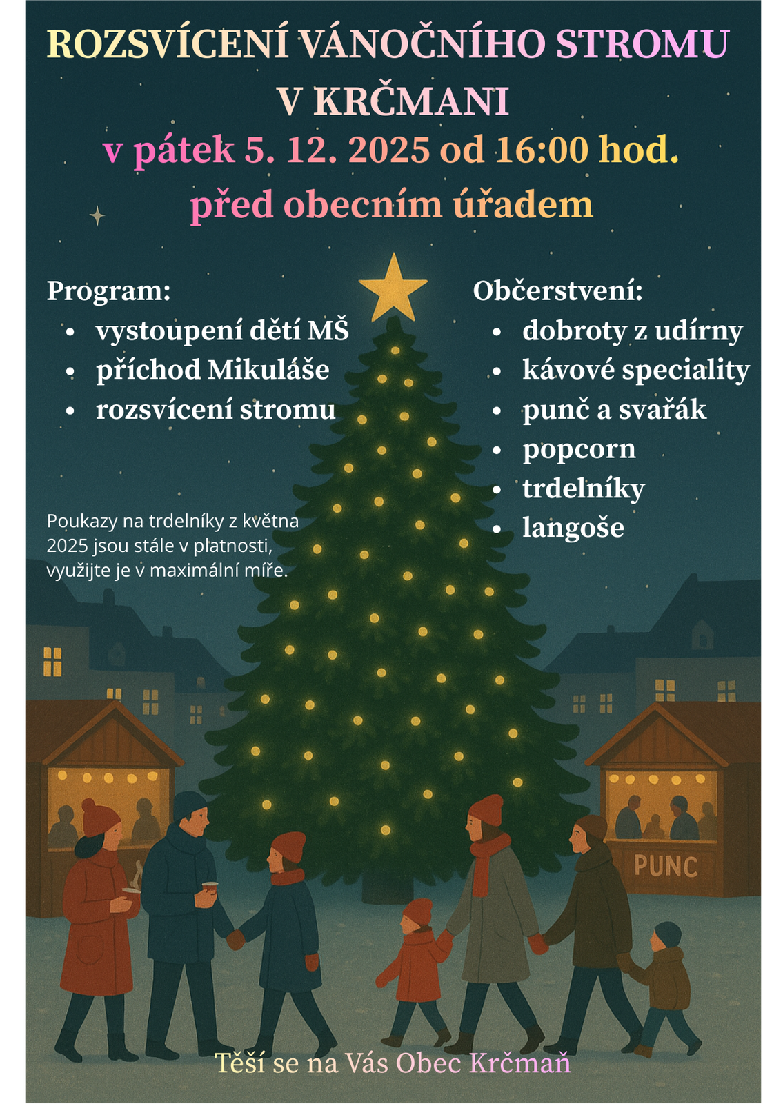 v pátek 5. 12. 2025 od 16.00 hod. rozsvítíme vánoční strom před obecním úřadem. Na programu bude vystoupení dětí z MŠ, příchod Mikuláše, rozsvícení stromu. Těšit se můžete na dobroty z udírny, kávové speciality, punč a svařák, trdelníky a langoše. Těšíme se na Vás.