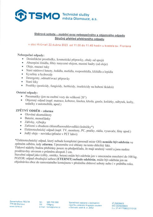 Sběrová sobota - mobilní svoz nebezpečného a objemného odpadu se bude v naší obci konat 22.4.2023 od 11:00 hod - 11:45 hod u kostela sv. Floriána.