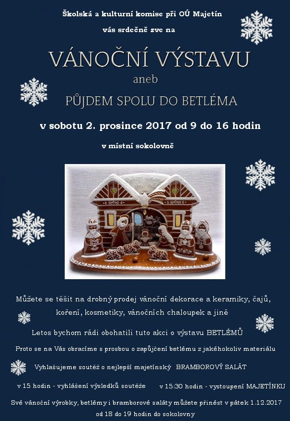 Šolská a kulturní komise při OÚ Majetín vás srdečně zve na "Vánoční výstavu aneb půjdem spolu do Betléma" , která se koná v sobotu 2. prosince 2017 od 9 do 16 hodin v místní sokolovně.