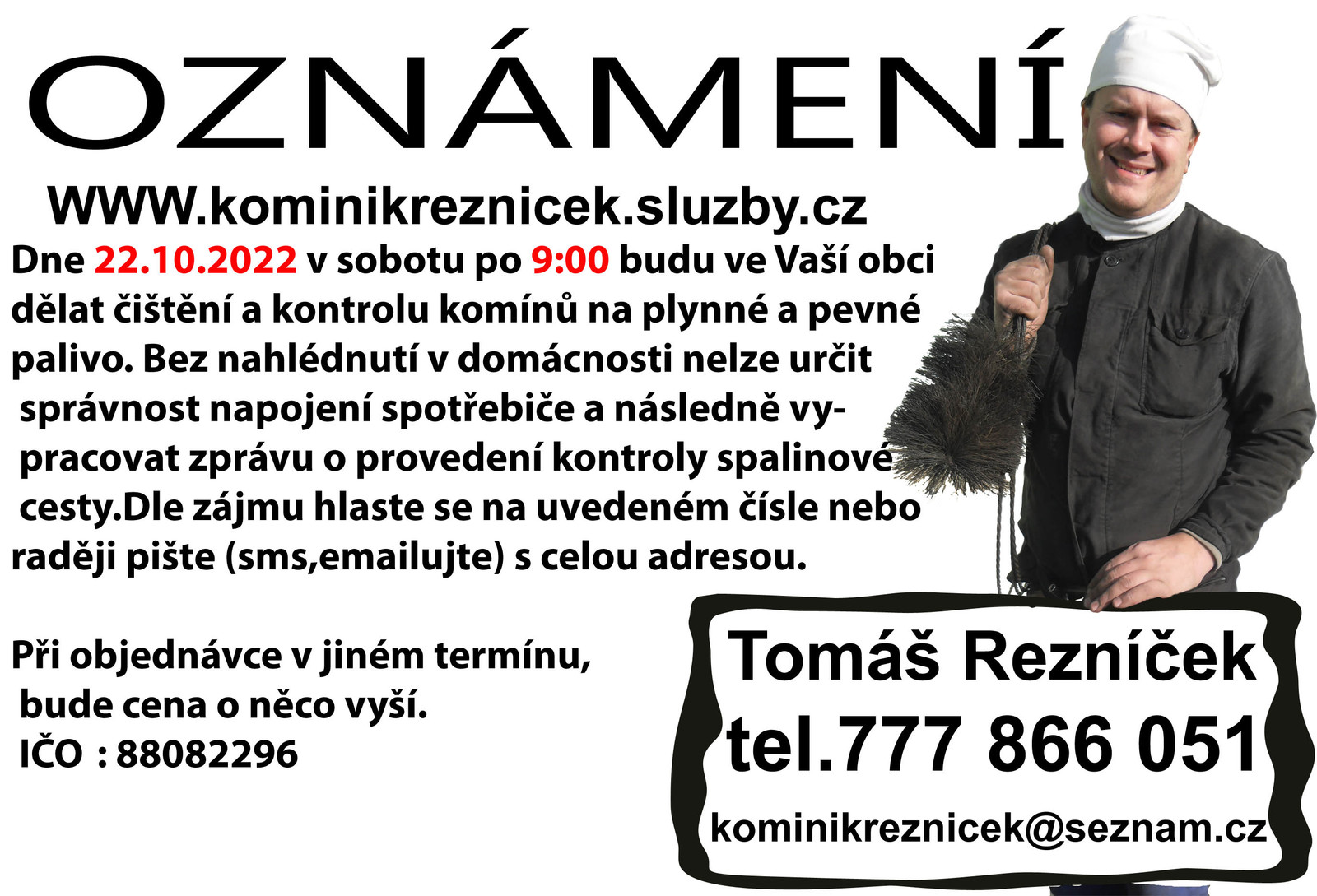 OZNÁMENÍ - kominík Tomáš Řezníček dne 22.10.2022 po 9:00 hodině bude v naší obci dělat čištění a kontrolu komínů na plynné a pevné palivo.